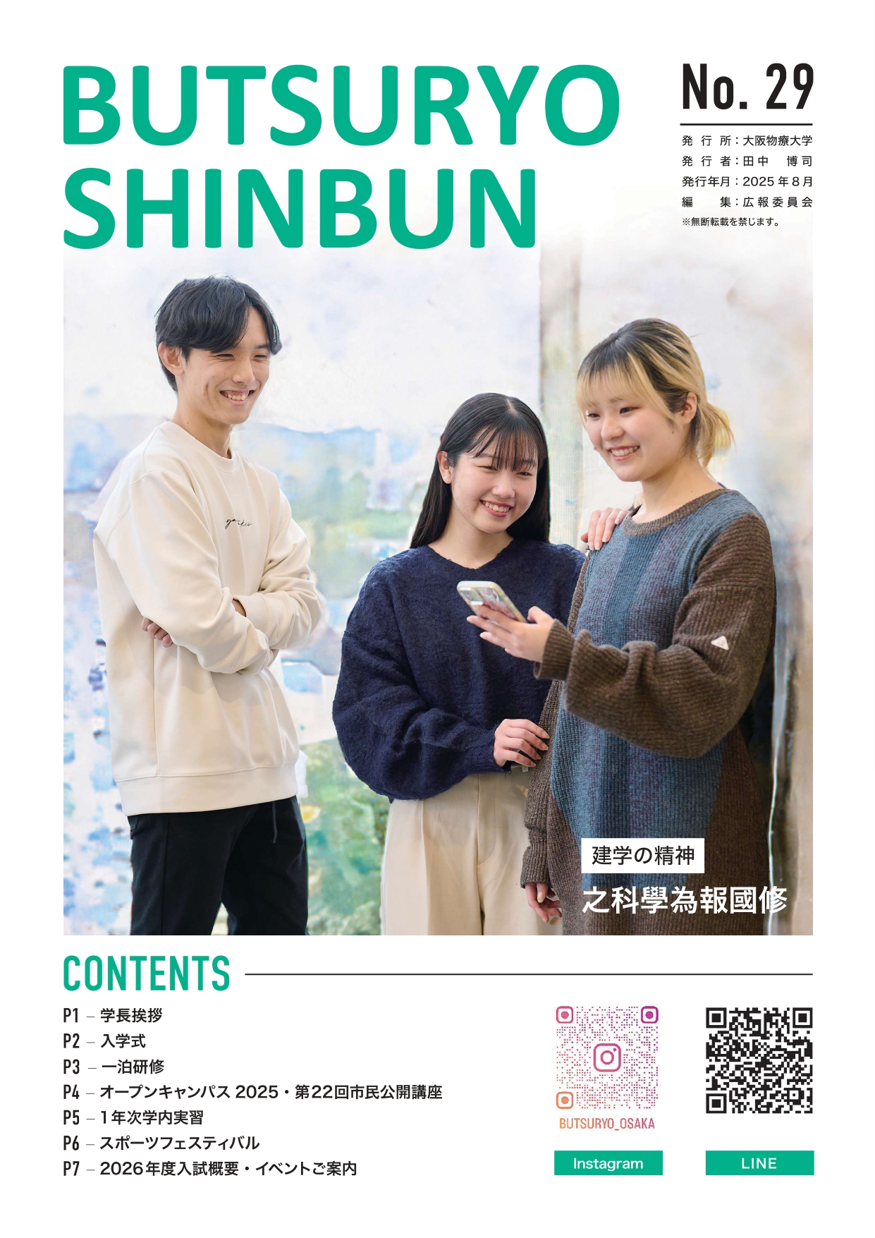「物療新聞」は、大阪物療大学が発行する大学新聞です。掲載情報は、大阪物療大学での教育やニュース、イベント情報、入試情報、資格取得関係など様々です。毎年2回発行(7月、1月)しております。